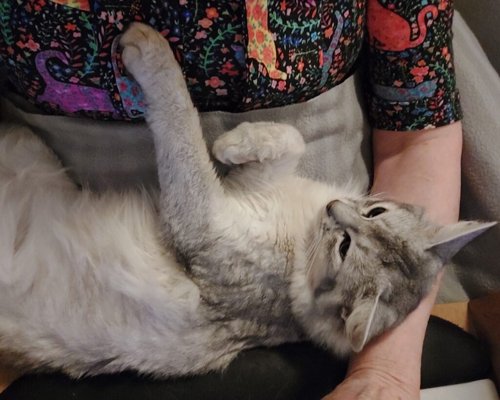 Ons heerlijke joch! We zijn zo blij met hem en wat is de tijd snel gegaan. Hij is inmiddels al een volwassen kater, op de standaard DNA-test na al helemaal geslaagd voor het andere testwerk zoals het knie-onderzoek maar gelukkig is hij nog steeds erg braaf in huis. Toen er poezen krols waren, had hij het even moeilijk en voorzag ik het nodige dweilwerk en het moeten gaan dragen van een katerbroekje tegen het gesproei in huis, maar die bui dreef gelukkig over. Helaas blijft Sheralyn bij haar ‘inteeltpreventie’ ondanks dat ze nu al maanden aan de suprelorin is en dus eigenlijk een castraatje is. Ze duldt hem niet echt bij zich in de buurt en hij vindt haar nu net zo interessant. Maar met een beetje afleiden, is dit vaak wel in goede banen te leiden.