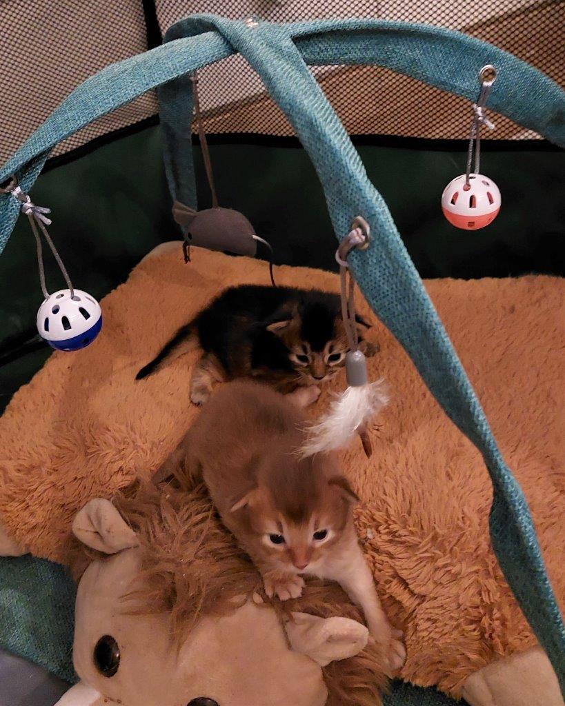 Mijn handen jeuken om weer foto’s van ze te gaan maken. Ik heb ook nog geen geschikte foto voor boven deze blog. Dan wil ik ze ook even laten ‘poseren’ op de nieuwe Cat Play Mat, de kittengym, die Karin ons gegeven heeft. De vorige was ook al een van haar cadeautjes. Daar hebben we zo ontzettend veel plezier van gehad. Maar helaas, die is ingestort en iedere keer wanneer ik in de Action was, waren ze er niet. Deze turquoise uitvoering die Karin heeft gevonden, is nog mooier!