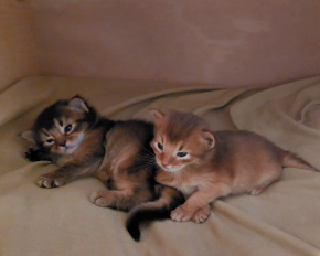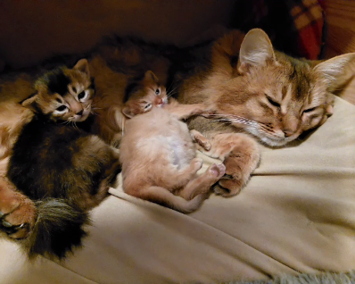 De start was niet echt goed. Daarover staat van alles in de vorige blog en op hun eigen pagina, het C-nest. Maar nu gaat het zo goed dat mama Sher het al nodig vindt dat ze verhuizen. Maar ik ben het niet met haar eens. Zo af en toe komt ze zelfs een kleintje beneden brengen. Sher is van de korte draagtijden en het eerder willen verplaatsen van het nest. Standaard is dit bij de meeste poezen precies drie weken. Maar Sher is niet standaard. Reden dat ik haar vandaag nog niet haar zin geef, is dat ik vind dat de kittens nog wat langer de warmte en beschutting van de afgedekte kraammand nodig hebben. Het sorreltje was later dan normaal met het openen van zijn oogjes en mogelijk is zijn oogzenuw nu nog te kwetsbaar. Hij mag dus nog niet te lang in het volle licht zijn.