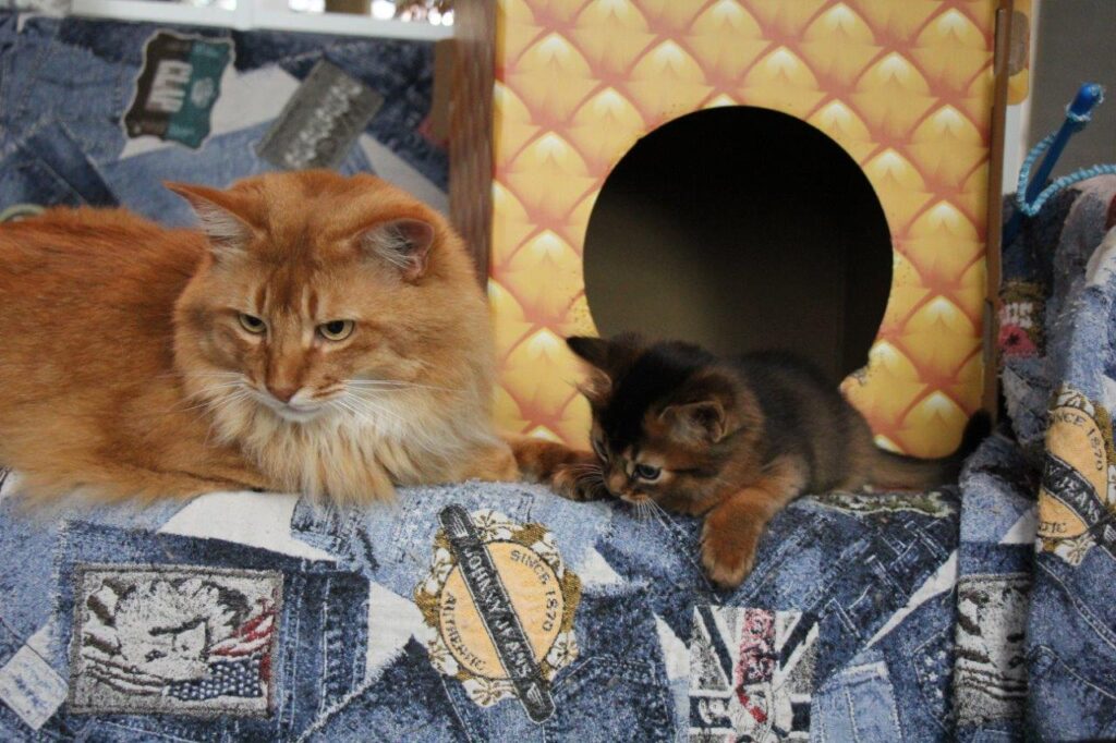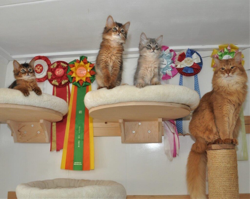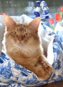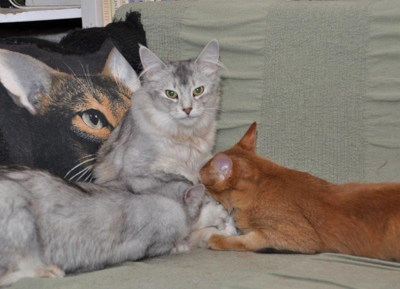 Michel hoeft zijn pet niet op te eten want hij had gelijk; de kittens van Kitty Jewel zijn een wildkleur poesje en twee sorrel katertjes. Ze zijn verrukkelijk en ze ontwikkelen zich uitstekend.