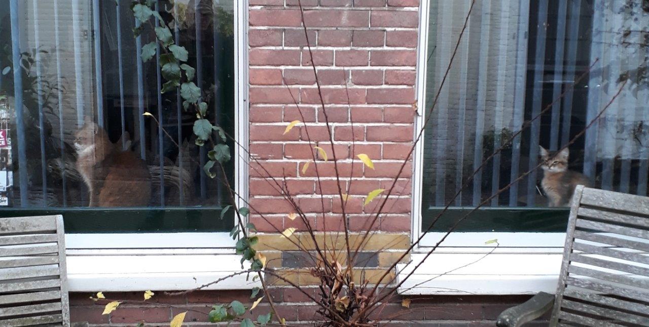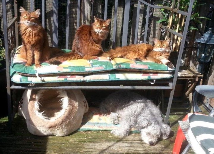 Orrie de zonaanbidster. Zodra de zon schijnt, is Orchid wel ergens buiten te vinden. Soms duurt het haar te lang en klautert ze omhoog om eerder van de straling te kunnen gaan genieten. In de loungehoek duurt het wachten het langst tot de zon een keer over het huis weet te komen. Het fotootje rechts bovenaan is zo’n leuk voorbeeld van haar inventiviteit op dit gebied. Links onderaan is een perfect voorbeeld van haar zelfvertrouwen.