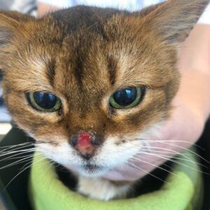 Ook heeft ze ons enorm laten schrikken met een hele vreemde wond op haar neusje. Zeer waarschijnlijk was dit een overgevoeligheidsreactie op alle met geur-, kleur- en smaakstoffen verrijkte liflafjes die ik door haar eten prak. Vooral de in haar ogen overheerlijke Sheba Soup leek de boosdoener. Nu ik iets voorzichtiger doseer gaat het weer helemaal goed. Alleen is haar neusje wel beschadigd geraakt. Ze loopt met een rose vlek rond die gelukkig wel steeds kleiner wordt.