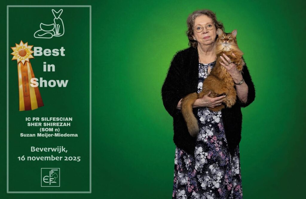 Het kon niet op met de titels voor Sher dit jaar: tot onze verbazing bleek Sher nog een keer in de prijzen te zijn gevallen. Ze heeft nu zelfs de titel National Winner 2025. Best-in-Show worden, levert punten op. Ik was zo gefocust op de Seniorentitel dat ik nooit aan de kans op de Winnertitel had gedacht.