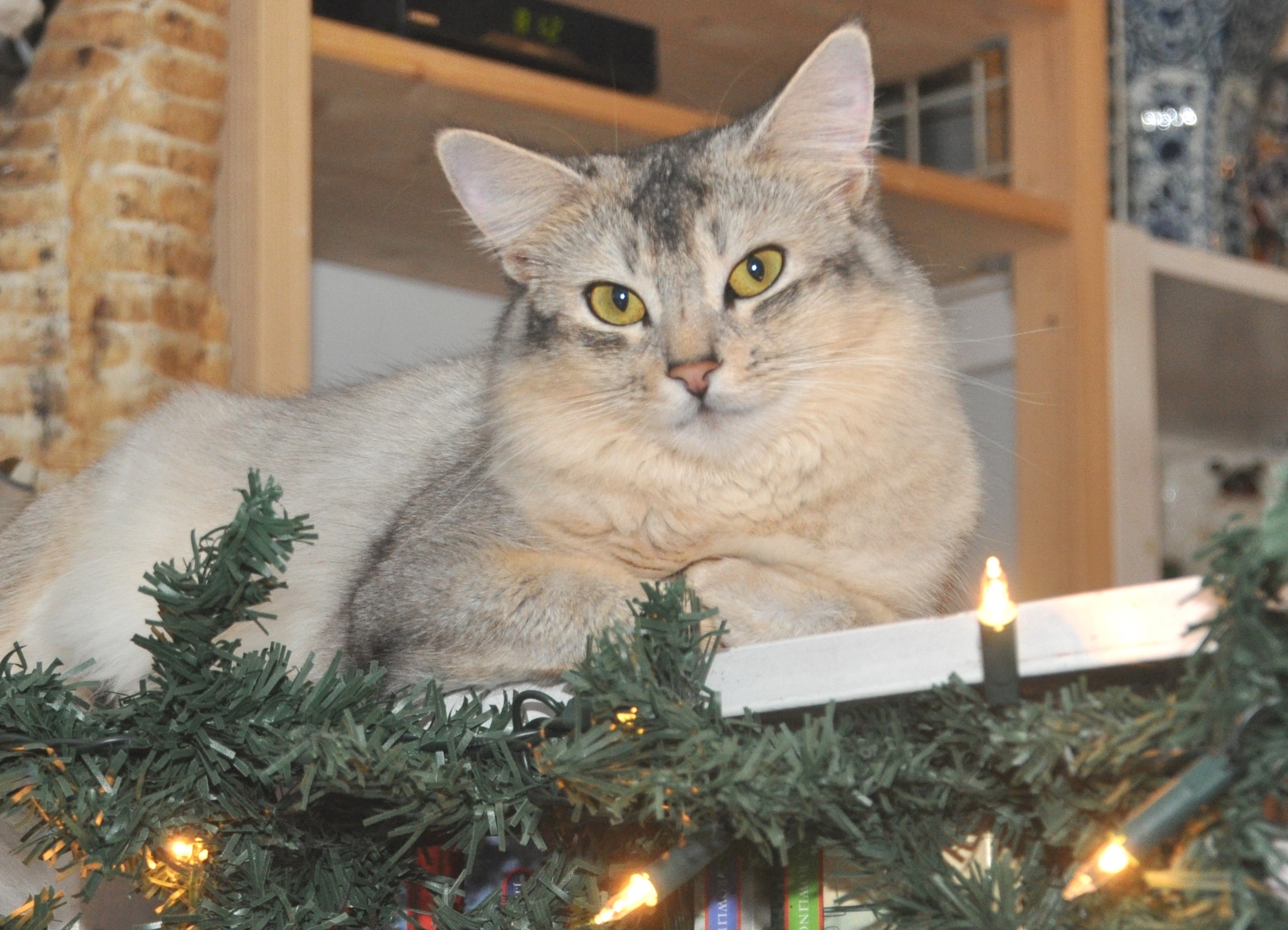 Helaas is Elfie toen ze nog niet echt volwassen was in conflict geraakt met Shabanou. Elfie lag spinnend naast me, totaal ontspannen, en Shabanou vond dat ze maar eens plaats moest gaan maken want het was haar beurt om naast me te komen kroelen. Het is altijd een gaande en komende kat wanneer ik ergens zit waar een kat naast me kan zitten. (Ik zit vaak in een luxe relaxstoel en dan kan een kat alleen naast me op de krabton of op schoot of op mijn benen bij me zitten.) Shabanou, nota bene haar bloedeigen overgrootmoeder, gaf Elfie een pets en Elfie schrok daar geweldig van. Sinds die dag heeft ze iets tegen een zilver met grote ogen.