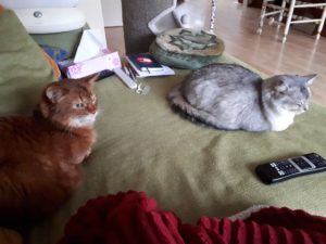 Vandaag waren we op bezoek bij Josja, de zoon van Anna waar Elfie en Borre woont. Josja heeft nu zijn eigen huis en dat moet een echt thuis gaan worden mรฉt een paar lieve katten. Daarom kwamen we meedenken over het catproof afzetten van zijn heerlijk ruime terras met een wijds uitzicht. Daar kunnen een paar Silfescians wel een goed kattenleven gaan krijgen. Anna liet me een recente foto van Elfie en Borre zien – die twee hebben het zo naar hun zin saampjes. Die heeft ze natuurlijk meteen doorgestuurd.