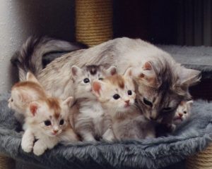 Rowena als hulpmoeder in de weer met de vijf poesjes van Elvira. Voor elkaars kittens zorgen, is hier heel gewoon. Zelfs de katers laten zich niet onbetuigd. The Fonz heeft dat zorginstinct als katermoeder niet van een vreemde. Rowena is nl. zijn moeder.