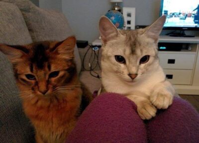 Qizmo en Pip, twee kittens die zeven jaar geleden bij ons zijn geboren, bleken ook last te hebben van spugerij. Deze katjes hebben verschillende ouders dus iets als aanleg kan niet bij ze spelen. Volgens hun mens Jolanda is er al wat verbetering merkbaar door ze wat vaker te laten eten. Ik hoop zo dat dit weer helemaal goedkomt.