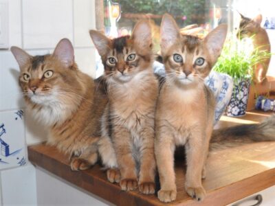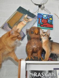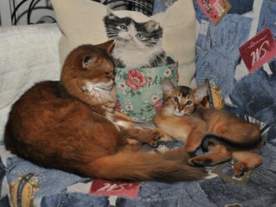 Prachtige datum. Precies tien jaar geleden was Imre hier om foto’s van onze dieren te maken voor een kattenkalender. Wat waren de foto’s mooi. Van bijna alle dieren hier zijn toen prachtige foto’s gemaakt waarvan er heel wat schitterden in de kalender van OverDieren. Hij was bedoeld voor alle raskatten maar de Somali’s domineerden behoorlijk. De eerste foto hieronder is van Jack met zijn zoontje Kismet, rechtsboven zie u Sijntje en daaronder ligt Tresca met haar kittens Soukh en Plumeau. Met Kismet, Soukh en Plumeau gaat het uitstekend maar helaas zijn de drie volwassen katten in deze fotocollage overleden. Sijntje heeft gelukkig ondanks haar nierfalen een mooie leeftijd behaald maar Jack en Tresca zijn helemaal niet oud geworden; slechts tien jaar. Van Jack is het nog maar een jaar geleden dat we hem moesten laten inslapen.