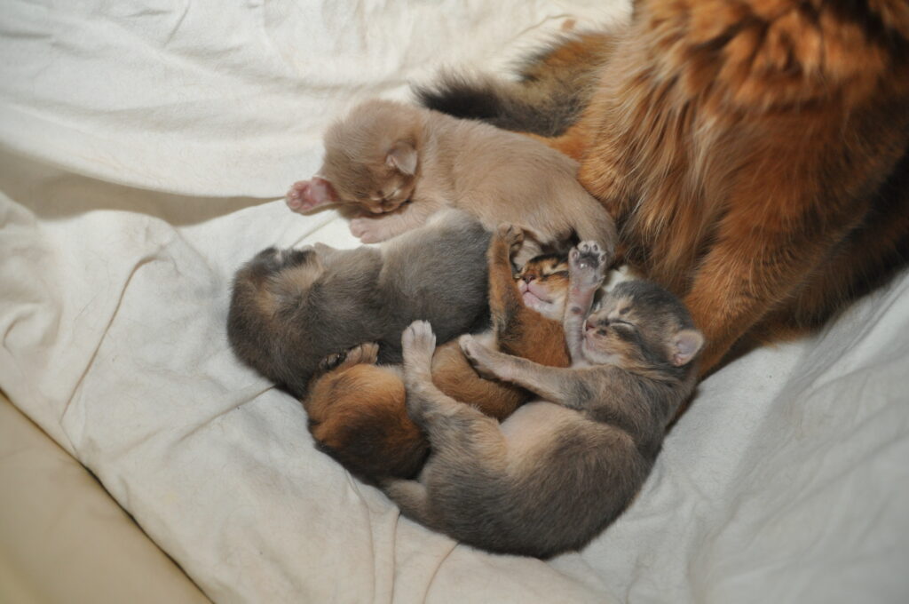 Onze katten werden dus niet gevaccineerd tegen niesziekte en ons eerst gefokte nestje groeide voorspoedig op. Wat deed moederpoes Shirezah het goed! En wat waren de kittens mooi en probleemloos. Het was drie maanden genieten.