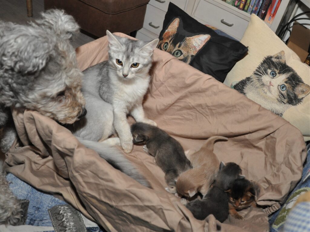 Het grootste feest is met ons ‘Feestje Sheralyn’. Ze doet het zo goed met haar kittens. Morgen worden ze twee weken oud. Die groeien dan ook als kool en hun gewichten zijn dus bijpassend. Straks even wegen voor de score.