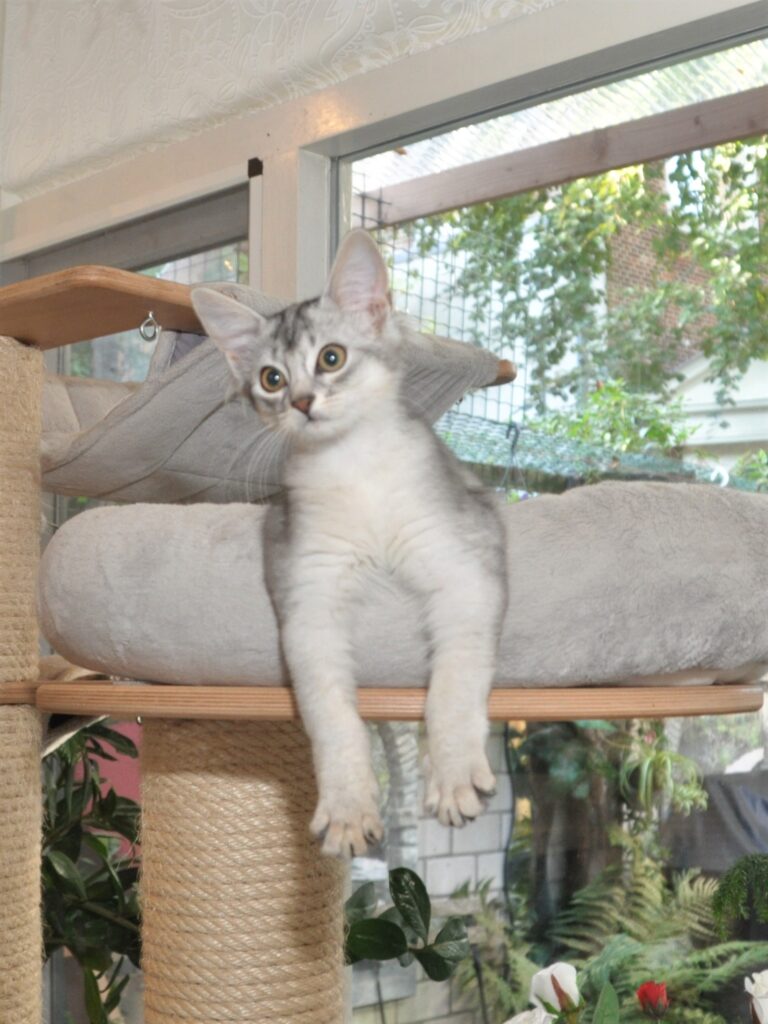 Bodiir is inmiddels een echte volwassen kater met alle bijbehorende eigenschappen van dien. En hij is zelfs al vader geworden ook. Zijn zoontje bij Sher is echt geweldig. Een hele mooie zilver én ook met een verrukkelijke persoonlijkheid. Helaas is het maar ééntje. Dit kwam zeer waarschijnlijk door zijn onervarenheid op dekgebied. Hij vond het gebeuren zodanig eng dat hij pas de volgende dag weer voldoende moed had verzameld voor de volgende poging. Daarna hadden ze de smaak te pakken en werd het bijna lopende bandwerk. Helaas mochten deze dekkingen niet meer baten want meestal sluit de baarmoedermond zich 24 uur na de eerste dekking. We hopen zo dat Sher en Bodiir een herkansing krijgen want dit is een perfecte combinatie.
