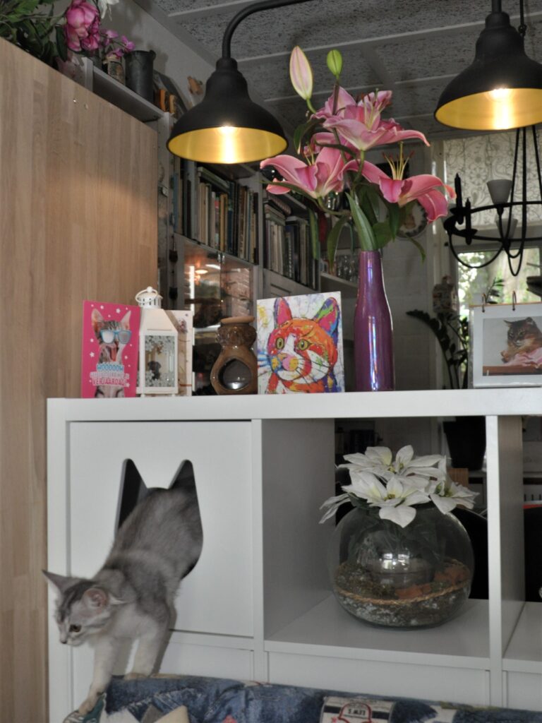 Wij zeggen iedere dag wel tegen elkaar hoeveel wij van hem genieten. Zijn persoonlijkheid, zijn enthousiasme, zijn gewoontes, intelligentie en handigheid, alles is perfect. Hij is echt een heel mooi en erg lief en gezellig katervriendje. Alles doet hij goed; eten, luisteren, spelen, ontdekken, de omgang met de andere dieren en na een kleine strubbeling met het hondje Polly gaat dat ook goed. Dat er eens een vaas omver gaat, ligt ook niet aan hem maar aan de vaas. Vazen met een bredere voet staan steviger 🙂