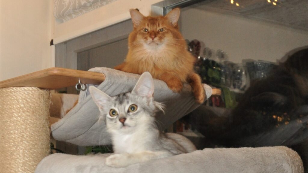 Soms kunnen ongecastreerde katers zodanig oversekst zijn dat ze zelfs op kittens gaan proberen te ‘rijen’ maar dat heeft Bodiir gelukkig nooit gedaan. Toen zijn kittens hier opgroeiden, was hij na de eerste wenperiode, heel lief en zorgzaam voor ze. Helaas is het me nog niet gelukt om de harmonie tussen hem en de anderen te herstellen. Met Shabanou durf ik het niet aan. Zij is met haar bijna zeventien jaar erg gevoelig voor stress dat haar dan een pijnlijke steriele blaasontsteking kan bezorgen. De hereniging met Bashiir, zijn idool van weleer, verliep in eerste instantie ideaal. Ze stonden gezellig samen te eten maar toen Bodiir aan Bashiirs achterkant ging ruiken, maakte hij zich ineens twee maten groter en zou boven op onze rode vriend springen. Gelukkig had ik net iets in mijn handen dat ik even voor zijn kopje kon houden zodat hij afzag van die sprong. Bashiir had niet eens gemerkt dat dit achter zijn rug gebeurde Daarna zijn ze elkaar een keer per ongeluk tegengekomen – dat ging ook niet goed maar verder dan wat imponeergedrag en verbazing bij Bashiir is dit gelukkig niet gekomen. Maar dit gedoe heeft me wel de moed ontnomen om hiermee verder te gaan.
