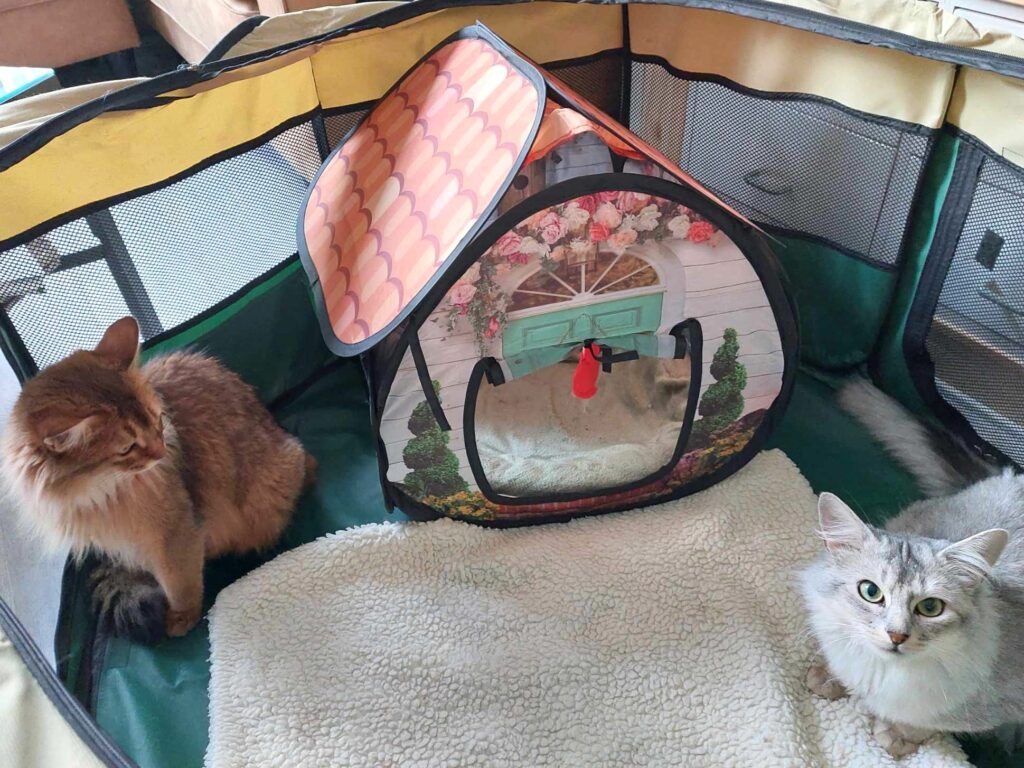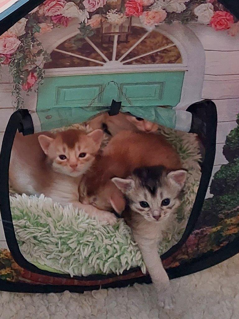 Toen de kittens ongeveer drie weken oud waren, verplaatste Sher haar kittens naar het puppyrennetje met het speelhuisje. Op de eerste foto was Bodiir het rennetje al aan het ‘inspelen’. Daarna ontwikkelden ze zich zoals al onze kittens tot volleerde bankhangers.