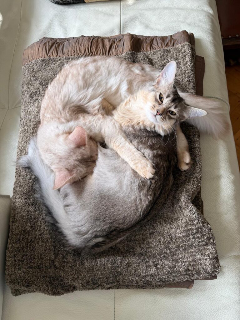 Hun onderlinge vriendschappen en die met de mensen waar onze kittens wonen (alle kittens van onze laatste nestjes wonen bij mensen die we al decennialang kennen) maken dat wij het als fokkers zolang hebben kunnen volhouden. We hopen zo dat Sheralyn en LeeLoo over zo’n anderhalf jaar nog een keer een nestje mogen krijgen!