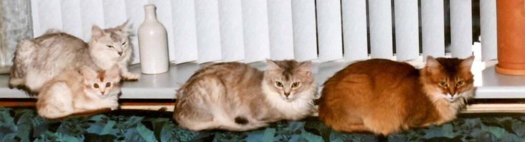 Wat hebben we genoten van dit speciale diertje. Ze was zo lief, zo sociaal, zo goed in de omgang met al onze dieren. Ze leek wel een magneet; iedereen wilde bij haar zijn. Tijdens het wachten op een bevalling had ze vaak haar kraamkistje niet voor zich alleen. Het was het mudvol met poezenlijfjes (onze katers deden hier niet aan mee) en af en toe zag je haar kopje tussen al die lijfjes omhoog komen voor een hapje frisse lucht. Als het moment van bevallen was aangebroken, moest ik de anderen toch even verzoeken ergens anders heen te gaan.