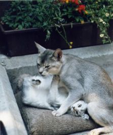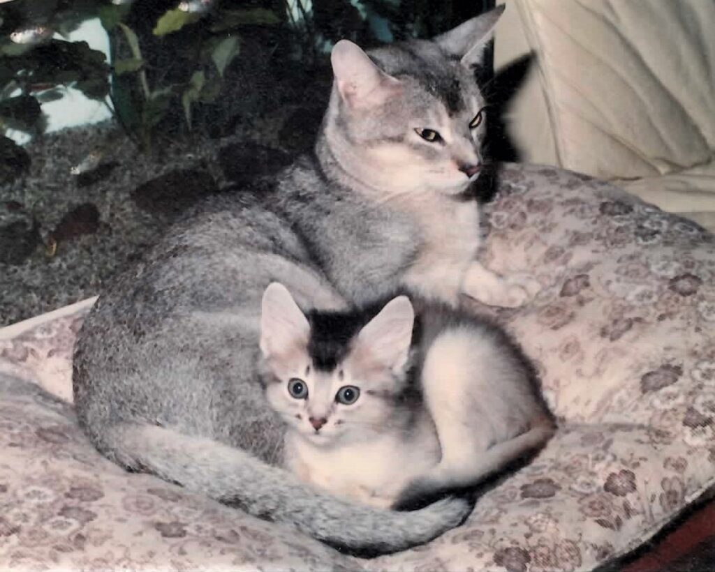 Foxy was een hele lieve zorgzame kater. Zie de foto’s hierboven. Hij nam zijn taken als katermoeder bijzonder serieus en ontlastte kittens ook. Op de eerste foto poseert hij met Roderick aka Rowan die later ook nakomelingen heeft verwekt. Die lijnen circuleren/-leerden in midden- en oost-Europa. Op de tweede foto uit 1989 verzorgt hij de later beroemd geworden Elvira (Sylvi’s Sensation).