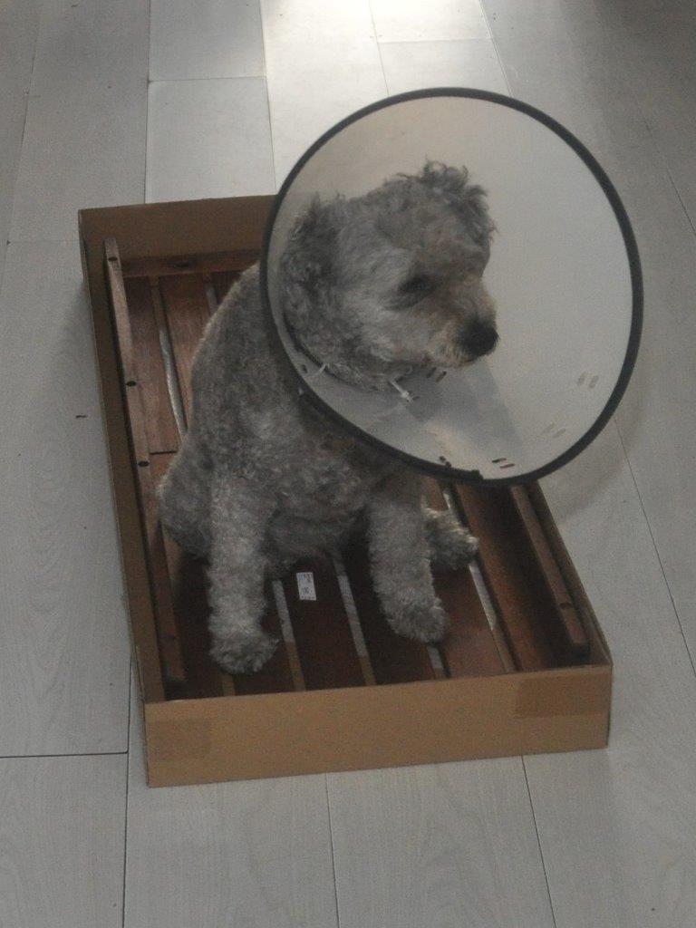 Om even uit de vicieuze cirkel van likken, natte jeukerige huid etc. te komen, draagt ze af en toe een kap. De lieve meid houdt zich met het omdoen aan alsof ze een ridderorde ontvangt. Ze is zo gevoelig voor een complimentje. Ooit heb ik haar blijkbaar op het juiste moment op de juiste manier een brave hond genoemd toen ze een plasje deed boven een put in de straat. Sinds die tijd hebben we dus een hondje dat haar plasjes bij voorkeur boven putten doet. Erg leuk om dan opmerkingen te horen als ´Wat een knap hondje´.