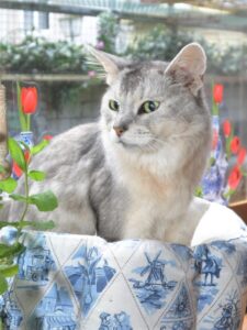 Wij wilden al heel lang een zilvertje hebben dat Kelly Kathleen in de stamboom zou hebben. Dit prachtige poesje heeft namelijk bijzonder weinig nakomelingen waarmee verder is gefokt. Wij zijn heel gelukkig dat wij Maverick konden krijgen want hij is niet alleen haar achterkleinkind (via haar zoon Silfescian Kathlena’s Dempsey) maar hij stamt ook af van Silfescian Just Jake, een zilveren katertje dat we net zoals Dempsey ooit naar Denemarken hebben laten gaan. Via deze twee katers zijn er met de Meef heel veel ‘stukjes’ van voor ons bijzonder dierbare dieren weer terug bij ons in huis gekomen. Kort na zijn geboorte zijn beide ouders van Kelly Kathleen (Elvira van 17,5 jaar en Fonzie van bijna 15 jaar) overleden, en in april 2008 Kathlena zelf ook. Mede daardoor is hij ons nog dierbaarder geworden dan hij ons al was.
