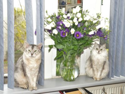 Deze bloemen zijn geweldig! Toen ik deze foto maakte, stonden ze al twee weken. We hebben ze gekregen van Ninon waar we Baldr gebracht hebben en wat Ninon zei is echt waar – katten talen niet naar deze bloemen. Het zijn Lisanthus, gekocht bij Flower XL in ‘s Gravenzande. Deze kweker werkt ook nog eens bij-vriendelijk! Maverick en Shabanou, de voorouders van hun katertjes, poseren erbij.