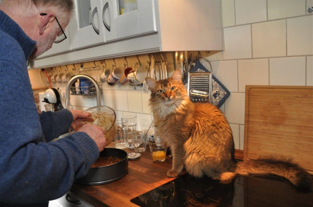 Tijdens de werkzaamheden in de keuken hield Sher hoopvol toezicht. Maar toen er nooit vlees of room bij kwam, droop ze uiteindelijk af. Het eten voor de katten ben ik ook wat aan het veranderen; minder koolhydraten maar wel voor de darmfunctie voldoende zemelen door af en toe wat psylliumvezels door hun vlees te mengen. Ik ben niet ontevreden over hun eetlust en de resultaten.