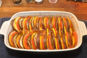 De eerste dagen nam Huibert op huishoudelijk gebied de honneurs waar maar dat hoeft niet meer. Maar hij heeft zoveel plezier in het kokkerellen gekregen dat er weer iets heel lekkers op tafel verscheen: ratatouille. Ik had er al eens een fotootje van gezien en wat Huibert fabriceerde leek er erg goed op. En lekker dat het was. Qua ingrediënten geheel in de stijl van Pioppi (zie de vorige blog). Wat helemaal niet in die filosofie paste, is zijn eerste taart: ontzettend lekker maar zo groot en machtig dat wij die, letterlijk, links en rechts uitgedeeld hebben. Tijdens het maken van deze blog geniet ik van hapjes taart en slokjes amaretto (dat zit ook in de taart). In plaats van de lunch. Als compensatie maak ik vanavond van de restjes groente van de ratatouille en wat er nog meer in de koelkast is te vinden een groentegerecht.