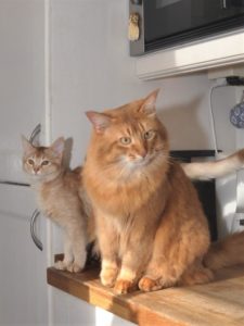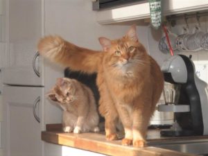 Het lukte Wiesje niet altijd om op het aanrecht te komen. Soms klauterde ze via de handgrepen van de laden omhoog – niet echt jofel voor de verf van de frontjes – soms ging het in één keer goed en soms mislukte het gewoon. Daar heeft de slimme meid een oplossing voor gevonden: gewoon via de prullenbak op de hogere kastjes voor het raam om daarvandaan als een ‘vliegende kat’ met een voor een kitten grote sprong alsnog op het aanrecht te landen.