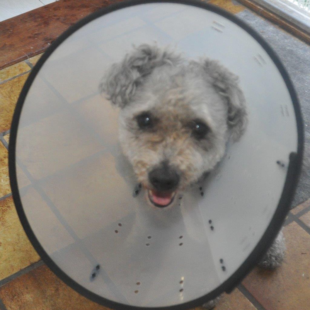 Deze keer is het de arme Polly. Pinkstermaandag heeft ze waarschijnlijk een insectenbeet opgelopen. We liepen met haar over de Grote Markt toen ze opeens reageerde alsof ze door een vlo werd gebeten. Een paar dagen later bleek ze enorme jeuk te hebben bij haar staartje. Ik had haar net getrimd en ze zag er weer prachtig uit. Alle zwarte uitgroei van de vorige insectenaanval waren eindelijk een keer uitgegroeid. Een paar dagen later vond ik een paar grijze plukjes Pollyhaar in de kamer. Het bleek dat ik na de trimbeurt wel goed gestofzuigd had en dat Polly zelf deze plukjes van haar staart had losgetrokken. Omdat ze maar bleef likken en plukken moest ze vrijdag naar de dierenarts. Met een injectie en een lotion dachten we haar van de jeuk af te kunnen helpen maar helaas. Donderdag is Huibert opnieuw met haar naar de dierenarts gegaan. Nu heeft ze een andere lotion (Cortavance huidspray van Virbac) en een pillenkuur (Apoquel). De dierenarts constateerde ook een licht anaalklierprobleem en heeft die kliertjes uitgeknepen. Ik dacht juist dat ze daar geen last van kon hebben gezien de harde keutels die ze onlangs had toen ze een tikje teveel bot had gegeten. Die techniek van het uitknijpen beheers ik vast nog wel want bij onze eerste Pumi, Urzsi, heb ik die kliertjes vaak moeten leegdrukken.