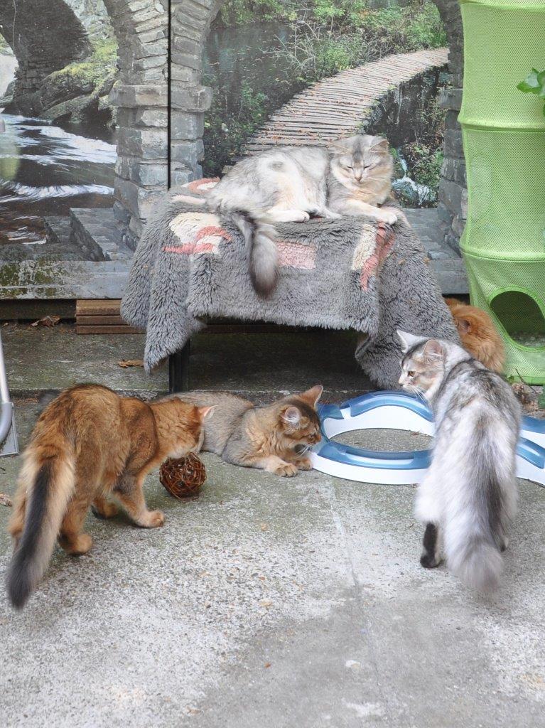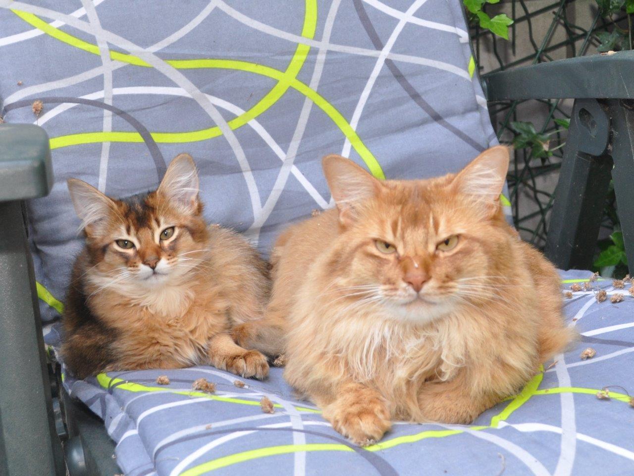 Umione en Nicky rennen op dit moment achter elkaar aan door huis en tuin. Het is weer droog tussen de regenbuien door. Het is echt grappig om hun kopjes te zien wanneer hun ‘buitenkamer’ weer eens in een douche veranderd is. Gelukkig zijn er heel wat droge plekken in de tuin dus ze laten zich al hun speelmogelijkheden niet ontnemen. Bij regen hebben ze zelfs een extra: het afdekplastic over de stapel kussens van de loungebank. Eén eronder en één erop; dolle pret. Hier en daar is het plastic door hun spel wel wat geperforeerd geraakt. Het droogt wel weer.