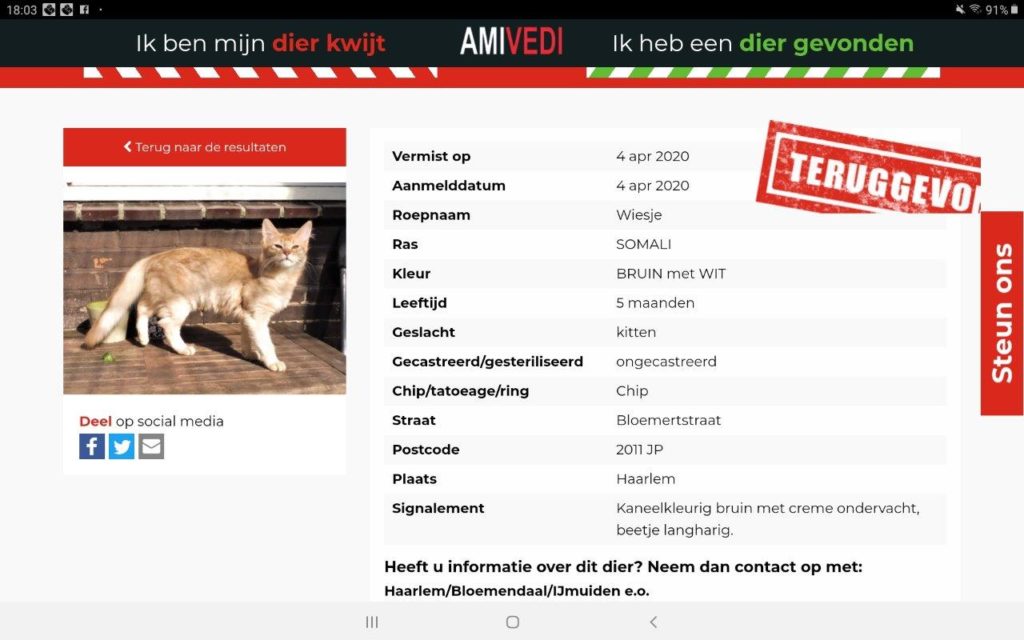 Toen ik boven polshoogte kwam nemen, liep Bashiir enigszins alert rond en Sher lag in een hoog mandje en leek niet van slag. Alleen zag ik Wiesje nergens. Ach, die zal wel beneden zijn maar daar bleek ze niet te zijn… Normaal hoef ik maar een kik te geven en ze rent naar me toe. Na een half uur overal gezocht te hebben, ben ik buiten in de uitgestorven straten gaan zoeken. Onder geparkeerde auto’s, onder de struiken en ik maakte de cirkel om onze straat heen steeds groter. Hoe groter die cirkel werd en hoe vaker ik die straten weer opnieuw langsliep of langzaam doorfietste, hoe wanhopiger ik werd. Ik weet namelijk dat zelfs de meest goed gesocialiseerde en aanhankelijke kat na een angstige ervaring geblokkeerd kan raken en dan niet meer reageert op bekende geluiden.