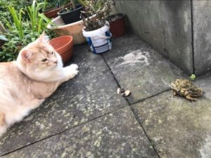 Ook nog een leuk berichtje over een neefje van Elfie: Jethro. Hij is niet alleen erg lief voor de kippen van de buurman maar ook deze padden wilde hij blijkbaar niet storen. Zijn vrouwtje Bernadette heeft de padjes naar een betere omgeving gebracht.