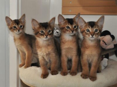 Sher met haar vier wildkleurige kittens; een Somalipoesje, een variantpoesje en twee variantkatertjes. Hun namen zijn…