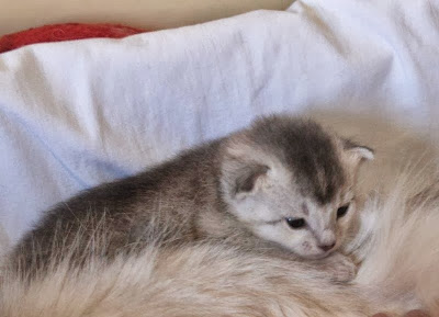 Wiesje bleek niet van plan om te wachten. In de nacht van 16e op de 17e is ze bevallen van drie prachtige kittentjes. De twee poesjes zijn net een poederdonsje. Dat komt door hun kleur, zacht sorrelzilver met een witte waas er over. Het katertje is een blauwtje. Zeer waarschijnlijk ook met zilver.