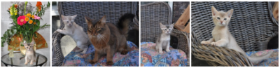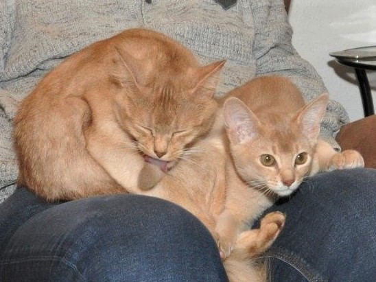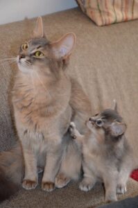 Ik ben er dus nog niet over uit of ons blauwtje met of zonder zilver is. Hij heeft totaal andere voorouders dan Peter Pan. Zijn moeder én zijn vader hadden veel meer polygenen voor zilver dan Wiesje en Kasper. Bij een blauwe Abessijn en Somali hoort de basiskleur havermoutkleurig te zijn. Afhankelijk van de polygenen voor een warme of koele kleur wordt het dan een lichte of een warme tint. Hiernaast een voorbeeld van moeder en zoon in het blauw uit een familie met veel kleur.