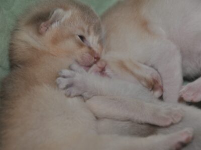 Vandaag zijn ze twee weken op de wereld én hebben ze – eindelijk – alle drie hun oogjes op. Ongeveer gelijktijdig beginnen ze dan ook te horen. Wel zo leuk voor moeder Wiesje die al twee weken tegen ze aan zit te koeren én voor mij want nu begint het mogelijk te worden dat de kittens opkijken wanneer ik een gek geluidje maak.