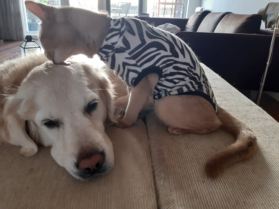 Monique maakt tweemaal daags een (foto-)verslag over hun wel en wee. De eerste dagen was Wiesje nog wat krols en we hoopten dat dit een handje zou helpen in de omgang met de twee honden Finn en Fozzie. Vooral Fozzie ziet de vriendschap met vooral de kleine Yfke helemaal zitten.