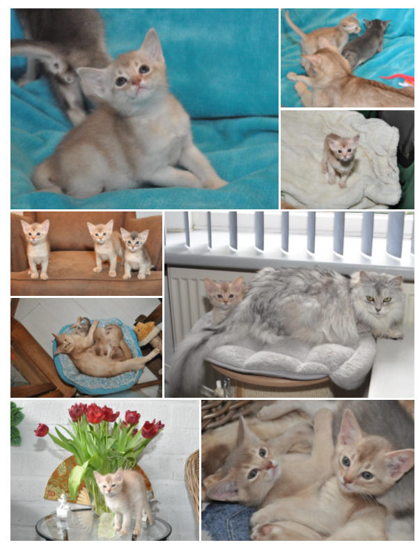 Ik ben er dus nog niet over uit of ons blauwtje met of zonder zilver is. Hij heeft totaal andere voorouders dan Peter Pan. Zijn moeder én zijn vader hadden veel meer polygenen voor zilver dan Wiesje en Kasper. Bij een blauwe Abessijn en Somali hoort de basiskleur havermoutkleurig te zijn. Afhankelijk van de polygenen voor een warme of koele kleur wordt het dan een lichte of een warme tint. Hiernaast een voorbeeld van moeder en zoon in het blauw uit een familie met veel kleur.