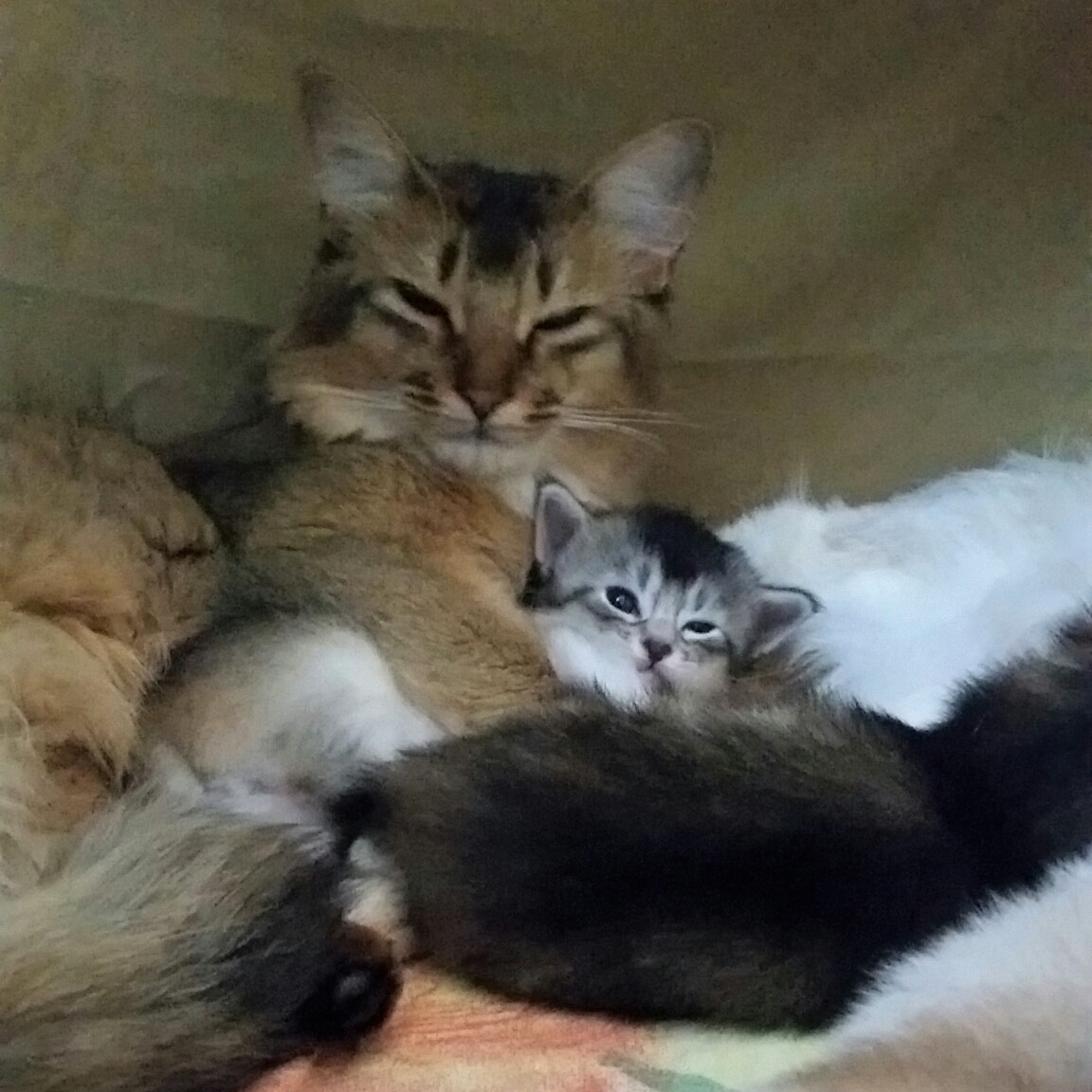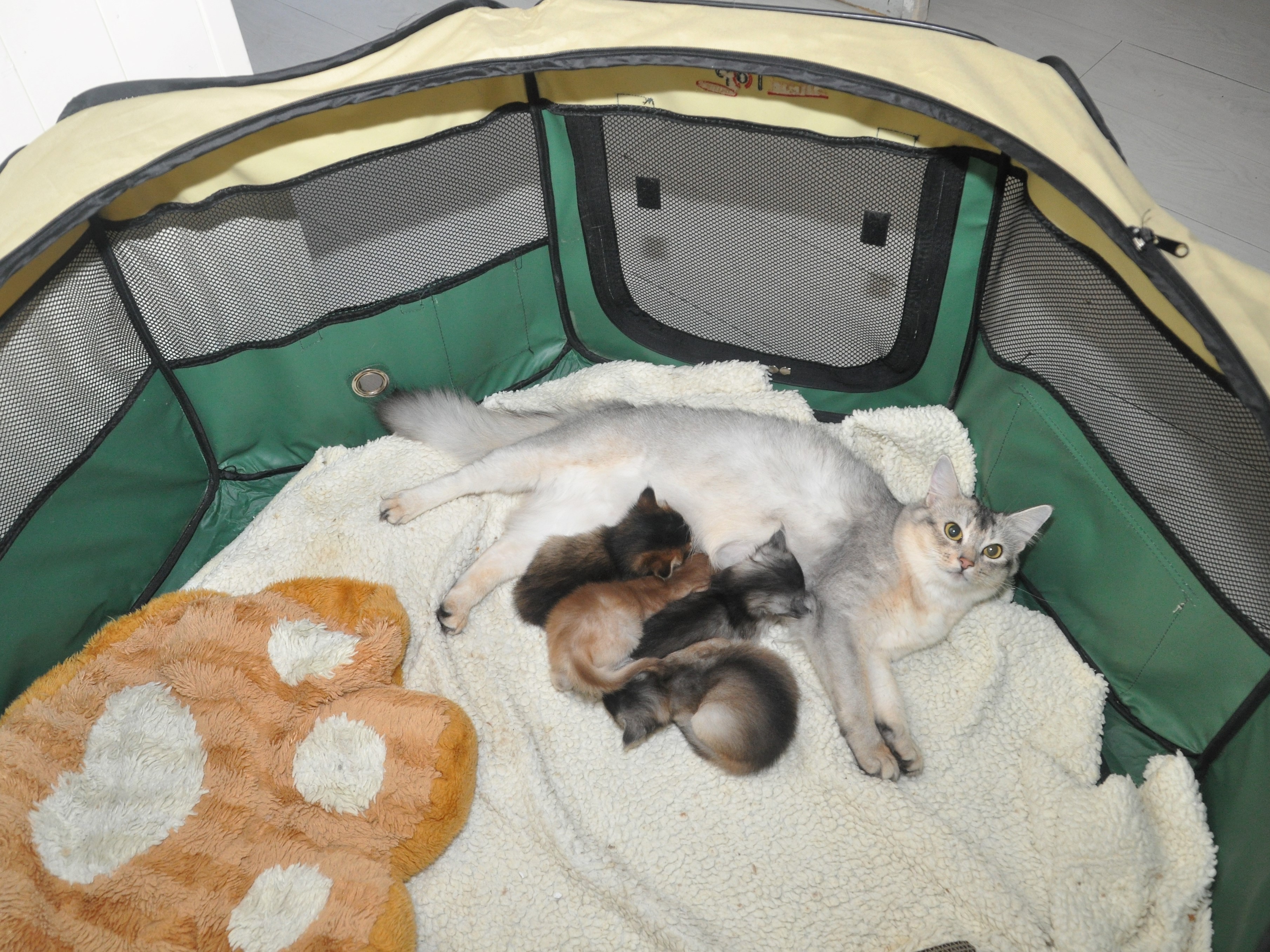 Wanneer kittens drie weken oud zijn, willen de meeste moederpoezen instinctief verhuizen en Elfie bleek hierop geen uitzondering. Vanwege de straatbarbecue zondag wilde ik het één dagje uitstellen maar zaterdagnachts begon ze al met een kitten te slepen. Moeders wil is wet, dus ze werden verhuisd. Eerst met de mand en de dag erna heb ik de mand weggehaald zodat er een ruimere plaats ontstond. Tante Sher is nu helemaal in haar element. Ze kan er nu echt bij en is er niet bij weg te slaan. De eerste dag was ze een beetje hyper de kittens wel heel erg vaak aan het wassen – ze maakte van de katertjes bijna poesjes 😉 – maar nu is haar gedrag genormaliseerd. Ik moet haar wel in de gaten houden want ze heeft wel de neiging om ze te ‘kit’nappen. Ik trof haar al een keer met alle kittens in de krabton aan en de arme Elfie kon daar echt niet meer bij.