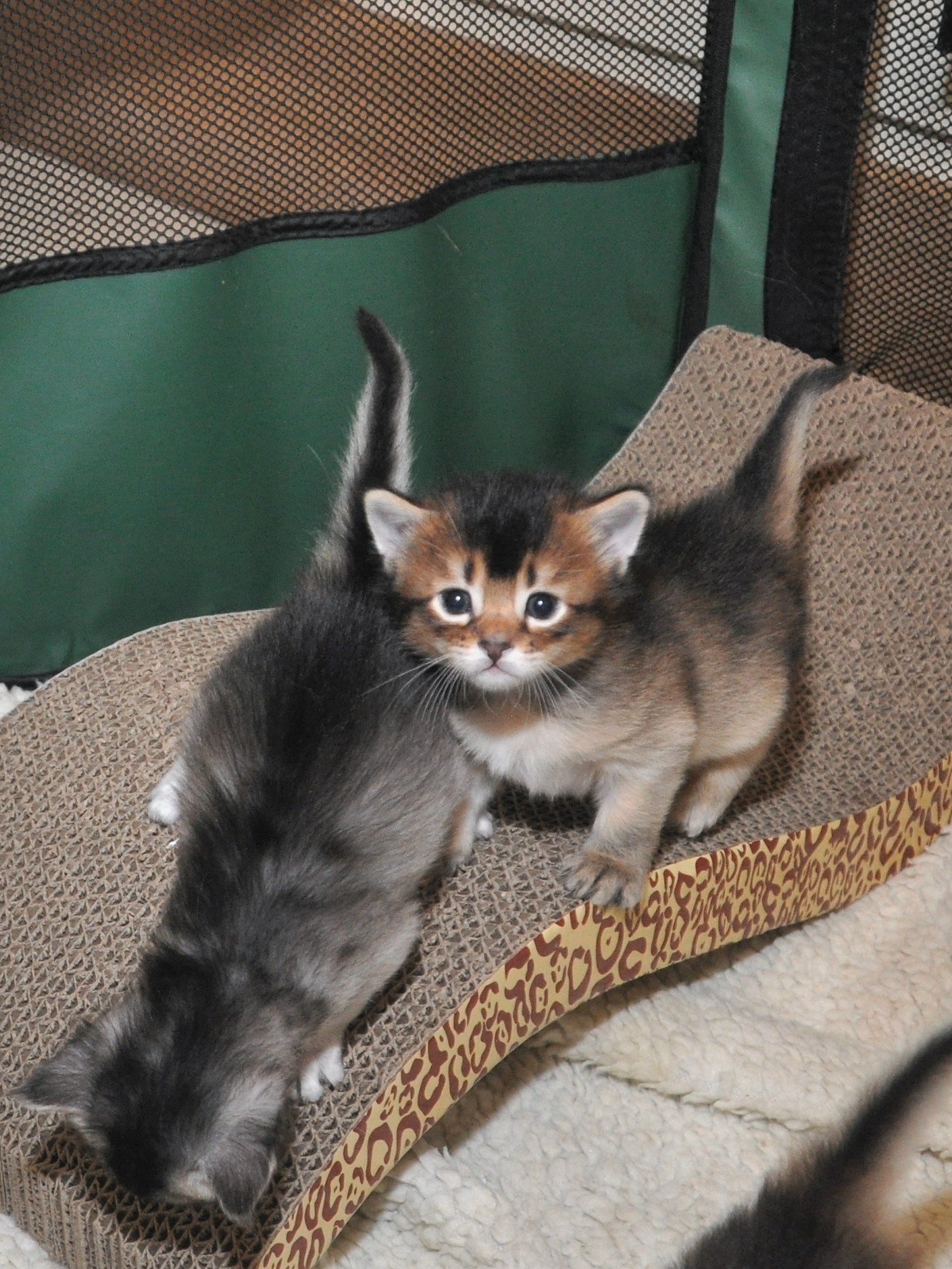 Het is gewoon niet bij te houden, zo snel als de kittens zich ontwikkelen. Gisteren zijn ze zelfs al eventjes beneden in het puppyrennetje geweest. En vanmorgen ook. Gisteren duurde het maar een kwartiertje; ik wil voorkomen dat moeder Elfie te stressig wordt. Vanmorgen ging het al veel beter en bleven ze dus ook veel langer beneden. Elfie ging er zelfs bij liggen om de kittens te zogen. Dat is een goed teken.