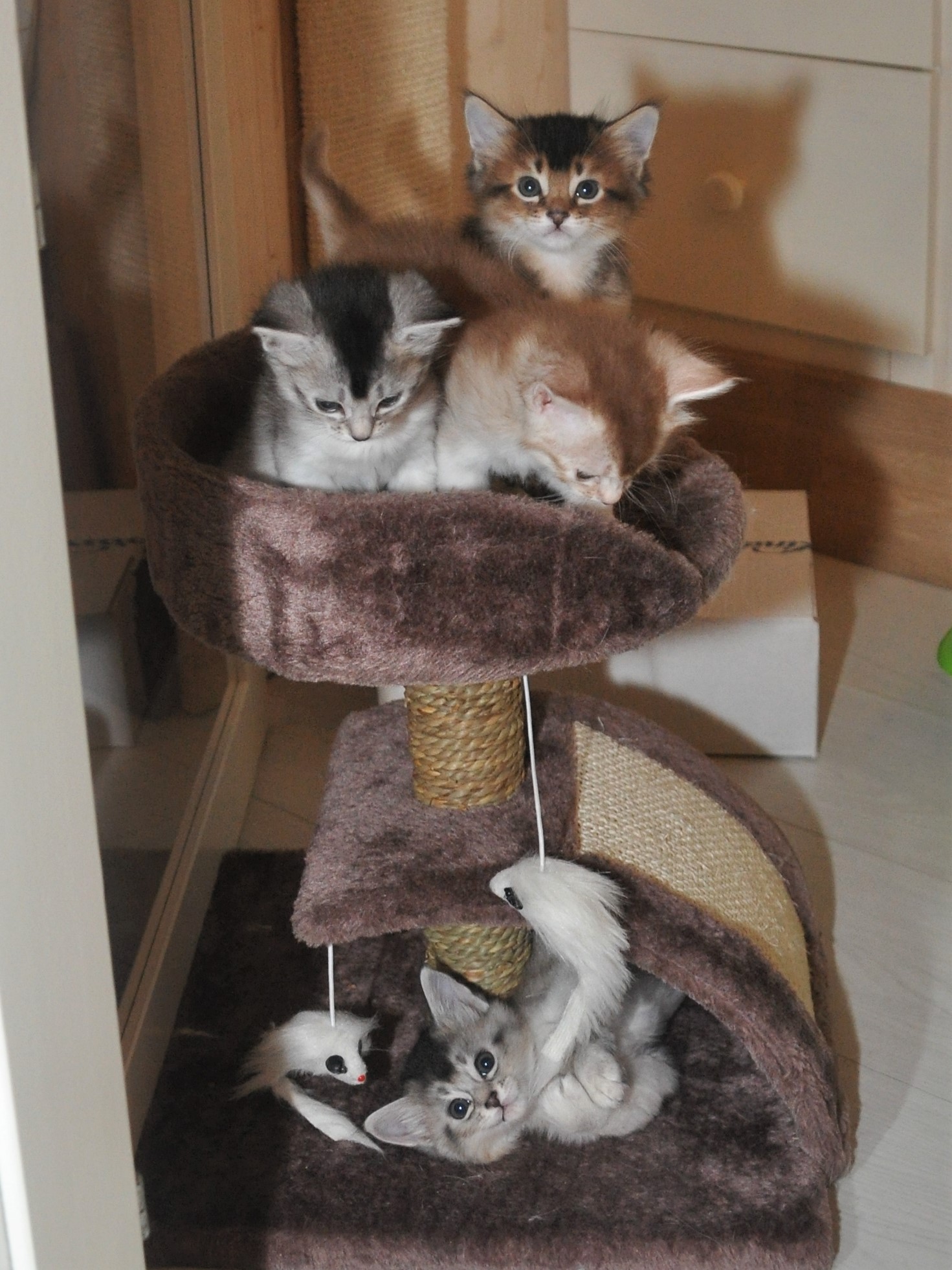 Ze zijn op dit moment in het rennetje in de huiskamer. Elfie ligt heel tevreden op het klimmeubeltje en de kittens liggen bij elkaar op een hoopje te slapen. Als ze straks weer aan de wandel gaan, zet ik het deurtje open en mogen ze even door de kamer scharrelen. Elfie heeft er iedere keer alle vertrouwen in. Gisteren zat ze vanaf Huiberts schoot haar kroost in de gaten te houden. Als de kittens boven zijn, hebben ze de hele slaapkamer en eenzelfde type deurtje als die van het rennetje in de kamer staat in het deurkozijn zodat ze niet de hele tijd alle kamers in kunnen. Ik heb Oliver betrapt tijdens een poging van het eten van een korrel kattenbakstrooisel.