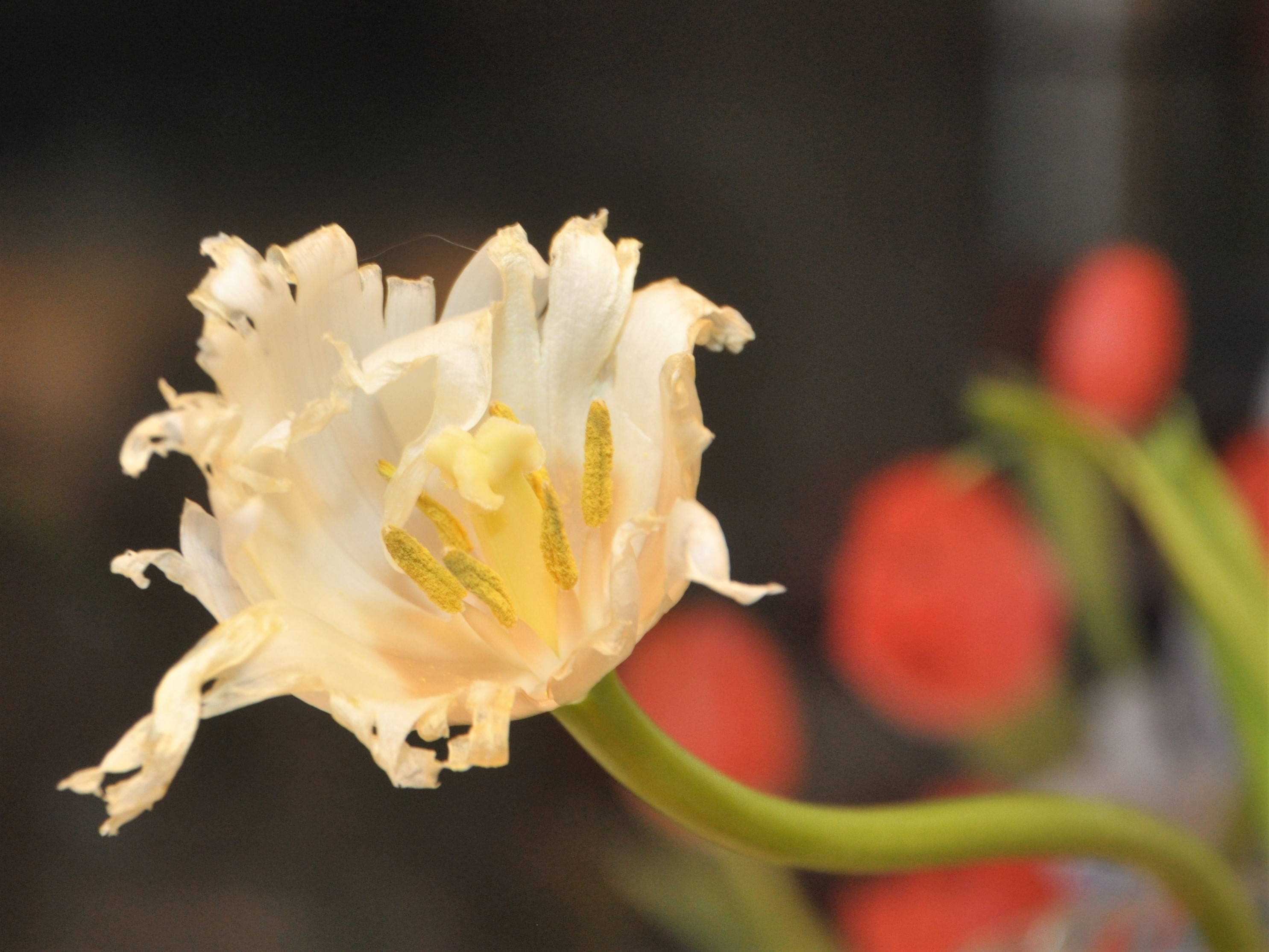 Belandde Huibert toch in het ziekenhuis! Op zondagavond de 12e ging hij al wat vroeger naar bed omdat hij zich niet echt lekker voelde en de volgende morgen gaf hij aan dat hij bang was dat er iets mis was met zijn hart. De huisarts stuurde een huisarts in opleiding langs en die vond het nodig dat Huibert met een ambulance naar het ziekenhuis ging. Tot onze schrik bleek hij naar het ziekenhuis te gaan waar het bij mij in 2008 ook met een hartprobleem, vnl. door administratieve blunders, bijna fout was afgelopen. Gelukkig is het ziekenhuis dat mij daarna opgelapt heeft nu gefuseerd met die van de slechte ervaring en zagen we allemaal bekende gezichten. Bij Huibert was de zaak al vrij snel onder controle, pijn weg door de vaatverwijders en bloedverdunners en de veel te hoge bloeddruk was ook snel genormaliseerd. Alleen ben je dan niet meer een spoedgeval en moet je dag in, dag uit wachten tot je aan de beurt bent om in een Amsterdams ziekenhuis gedotterd te worden/stent plaatsen. Uiteindelijk was Huibert vrijdag als laatste van de dag aan de beurt en toen had hij de pech dat de behandeling mislukte. Dat was een grote teleurstelling. En hij mocht ook niet naar huis omdat ze hem niet stabiel genoeg vonden. Dan duurt een weekend lang. Er is nu een nieuwe datum geprikt en we zijn heel blij dat Huibert dinsdag naar huis mocht om deze afspraak thuis af te wachten: 10 maart moet het gaan gebeuren! We zijn dus nu weer gezellig samen thuis en ik heb ook weer tijd voor de computer (dat lukt echt niet wanneer ik én onze Polly goed wil uitlaten en steeds Huibert op zoek in het ziekenhuis). Nadelen hebben ook voordelen en dat was in dit geval de bossen bloemen en de foto’s die we daarvan als herinneringen hebben. Dit filmpje (op Facebook en je moet ervoor even omhoog scrollen) Sher en de witte tulp is van de eerste bos waarvan de twee tulpen weinig overlevingskans bleken te hebben. Van de witte die inderdaad onweerstaanbaar bengelde, heeft zij ‘eigenbekkig/-potig’ een papegaaitulp gemaakt.