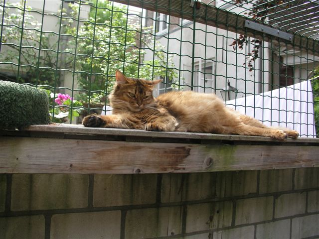 Alle katten genieten van het heerlijke weer en Nieckje tankt nog even wat zonvitamientjes. Elvira kan ook weer desgewenst door de detectiepoortjes. Het ijzerwerk, de nietjes, zijn verwijderd. Het was zo klaar, ze hield zich wederom perfect aan en het wondje ziet er keurig rustig uit.