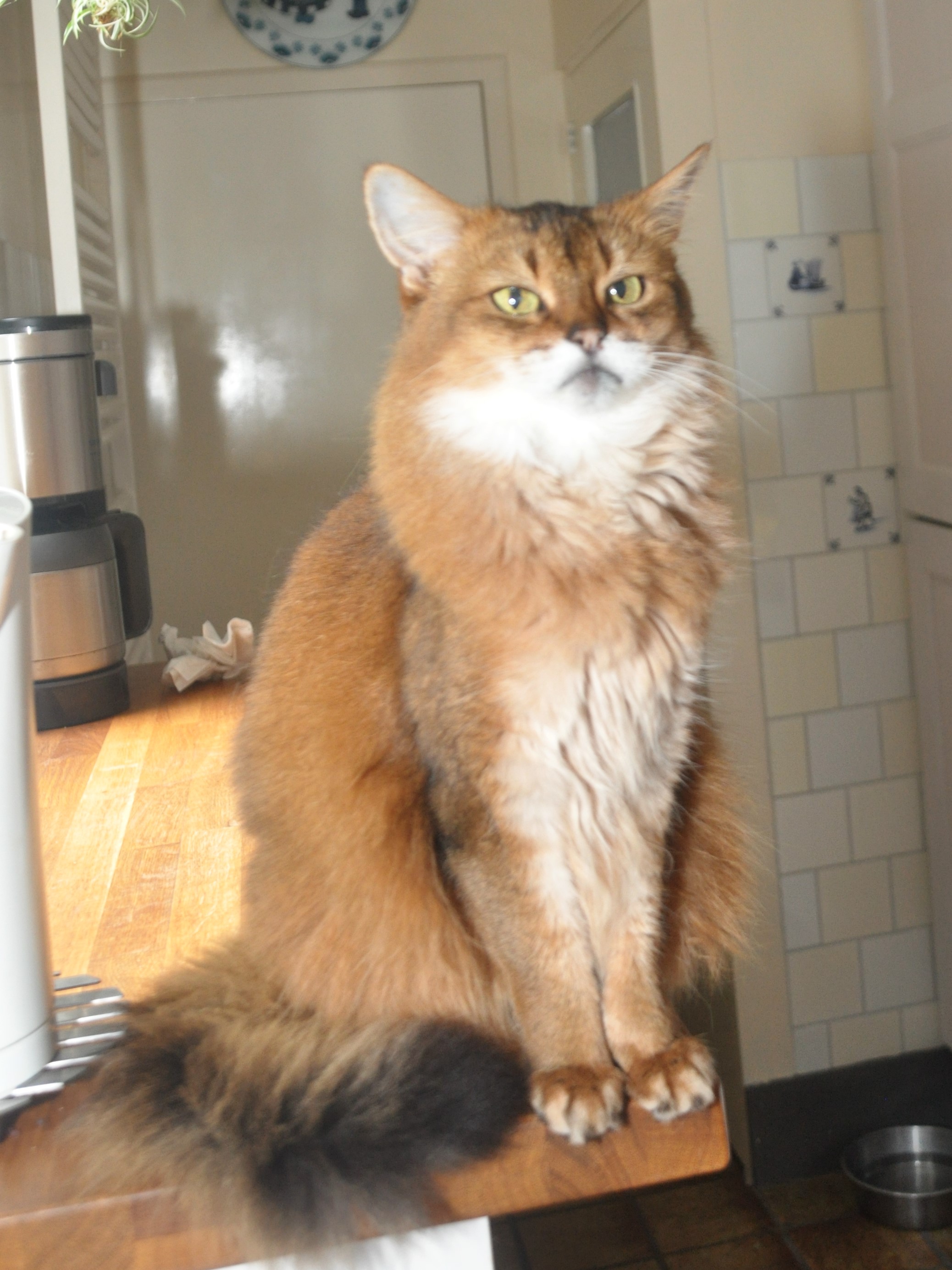 Onze Orchid was dus weer snel boven water maar toch is er iets heel vreemds met haar aan de hand. Ze was zaterdag erg schichtig en onrustig. Geen idee wat er met haar aan de hand is. Gelukkig heeft ze wel gegeten. De dagen er na toonde ze af en toe normaal gedrag en af en toe was ze wegkruiperig. In donkere hoekjes willen zijn (hoofdpijn?), ik vind haar ook vaak naast de kattenbak in de stookkast en vandaag gaat ze steeds in de kittyclimber buiten zitten. Het is lekker weer, de climber hangt onder een parasol dus ze zit hoog en droog. De hoofdpijn kan eigenlijk het probleem niet zijn want wanneer ze tijdens ‘een aanval van overactiviteit’ op de vensterbank heen en weer rent en steeds over de spullen daarop springt. Dat vermijd je toch liever wanneer je hoofdpijn hebt. Het is ook niet onmogelijk dat ze misschien buikpijn heeft. Ik zag in de kattenbakken dat er iemand diarree heeft gehad. Ik heb heb haar vandaag een lekker hapje opgeleukte Carnibest met Isogel gegeven. Dit ging schoon op en dit middel, kan wanneer er inderdaad een buikprobleem speelt, wat rust daar geven en anders is het een probaat middel om van een evt. haarbal af te komen. Ik hoop zo dat er niets echts aan de hand is en dat we onze Orriechiddie zoals ze hoort te zijn, weer terug krijgen.